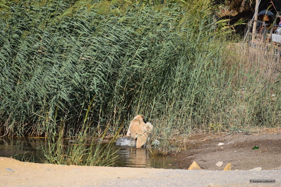 Un chien s'ébroue dans les roseaux