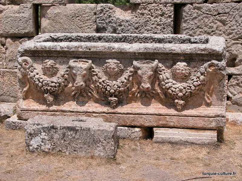 Les sarcophages d'Asie mineure, comme ceux d'Athènes, sont sculptés sur quatre faces et dès l'époque flavienne [69-96 après J. C. ] ornés de lourdes guirlandes accrochées à des têtes de boeuf. Les sarcophages, d'abord bas et allongés, deviennent au quatrième siècle, des monuments très hauts.