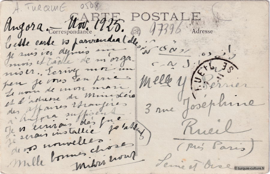 La carte postale reproduite ci-dessous fut envoyée en février 1936 à Annie de Courlon (1905-1991) peintre-graveur française par une femme française dont le mari avait "accepté un poste intéressant auprès du gouv[ernement] turc pour les travaux de leur nouvelle capitale."