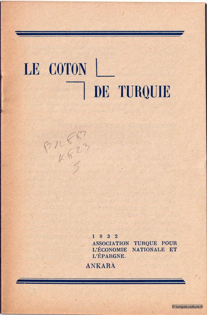 La culture du coton en Turquie a un passé qui remonte à plusieurs siècles. Pendant les XIXe et XVIIIe et même encore le XVIIe siècles, les récoltes des régions de Smyrne, de Brousse et d'Adana, où l'on cultivait déjà plus ou moins intensivement le coton, atteignaient des chiffres assez considérables.