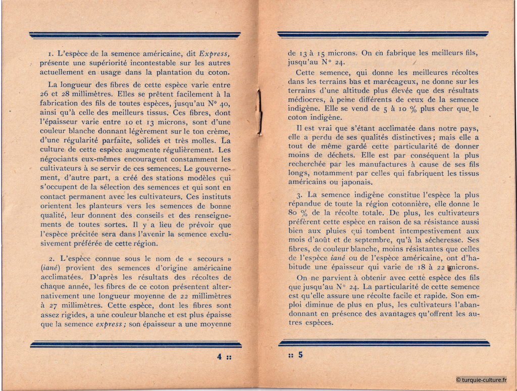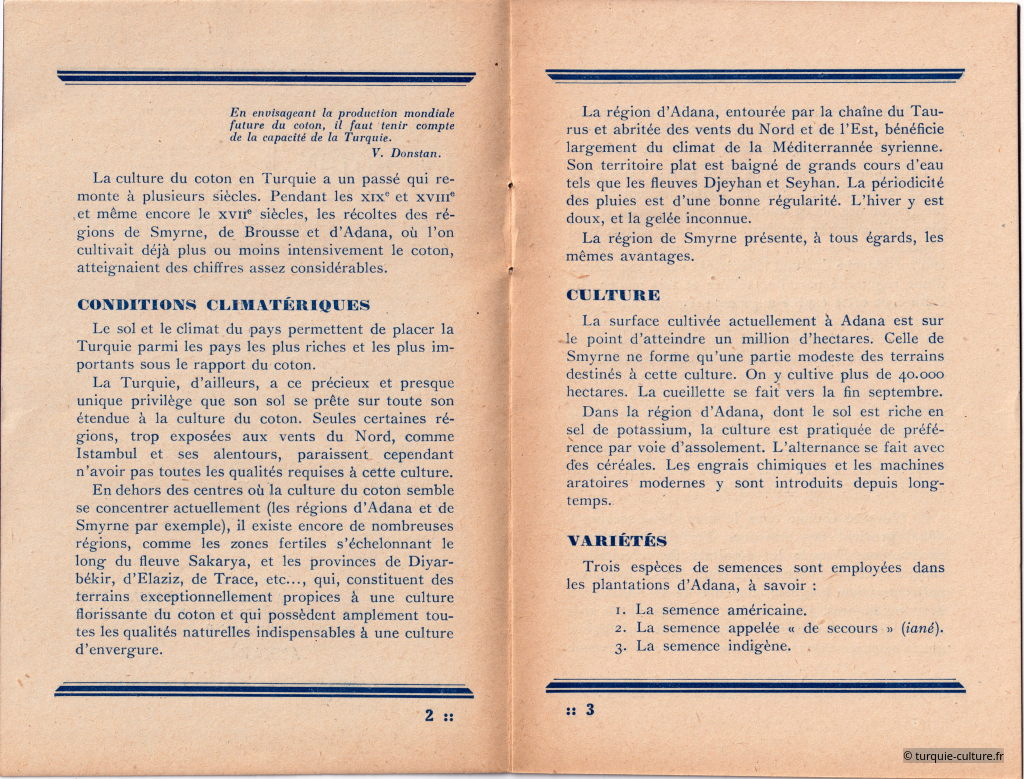 En dehors des centres où la culture du coton semble se concentrer actuellement (les régions d'Adana et de Smyrne par exemple), il existe encore de nombreuses régions, comme les zones fertiles s'échelonnant le long du fleuve Sakarya, et les provinces de Diyarbékir, d'Elaziz, de Trace, etc..., qui, constituent des terrains exceptionnellement propices à une culture florissante du coton et qui possèdent amplement toutes les qualités naturelles indispensables à une culture d'envergure.