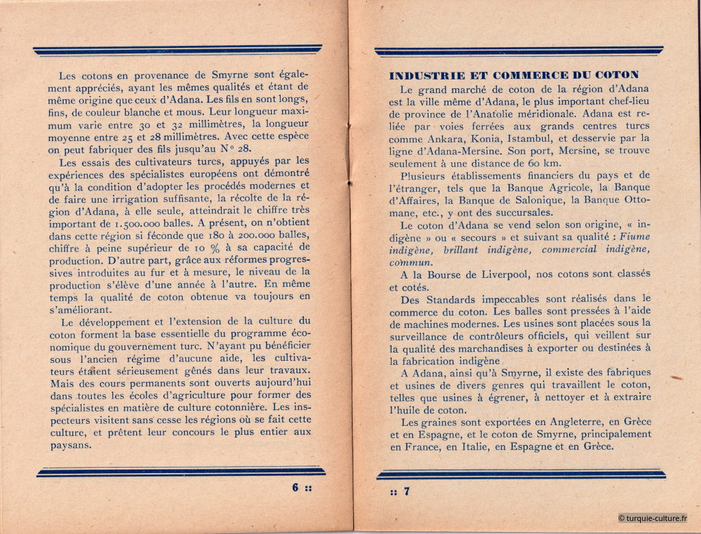 Le développement et l'extension de la culture du coton forment la base essentielle du programme économique du gouvernement turc. N'ayant pu bénéficier sous l'ancien régime d'aucune aide, les cultivateurs étaient sérieusement gênés dans leur travaux. Mais des cours permanents sont ouverts aujourd'hui dans toutes les écoles d'agriculture pour former des spécialistes en matière de culture cotonnière. Les inspecteurs visitent sans cesse les régions où se fait cette culture, et prêtent leur concours le plus entier aux paysans.