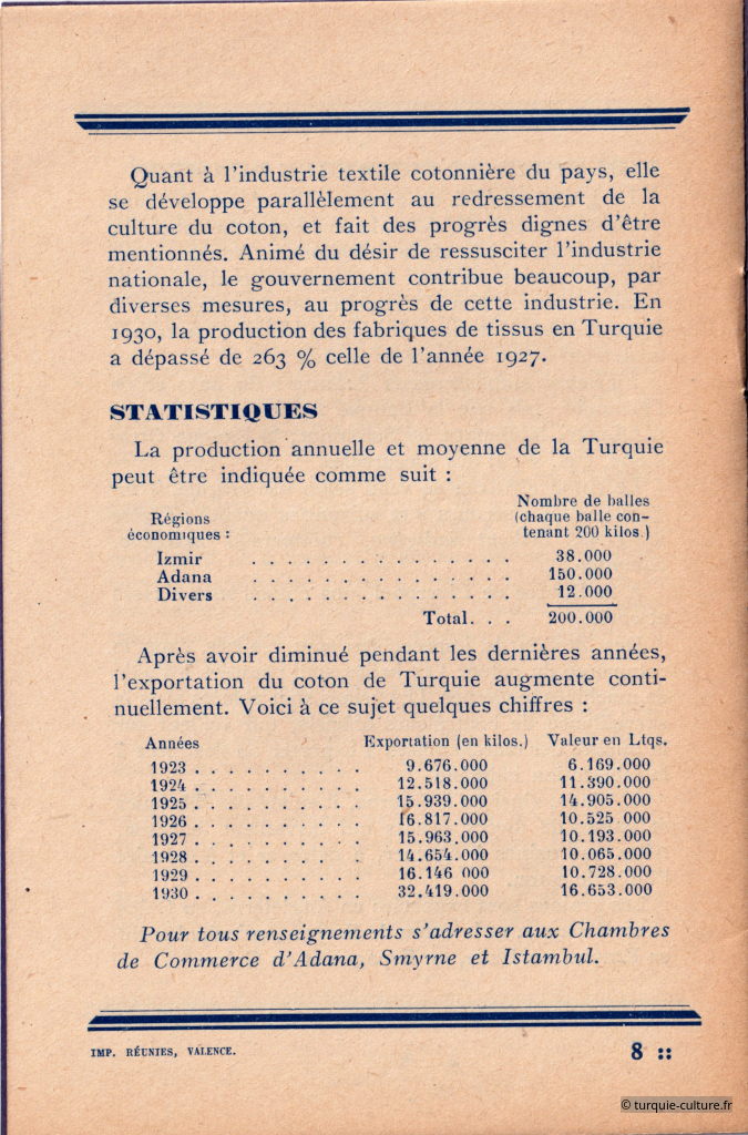 Pour tous renseignements s'adresser aux Chambres de Commerce d'Adana, Smyrne et Istambul.