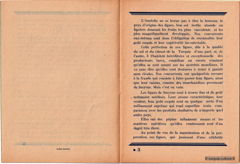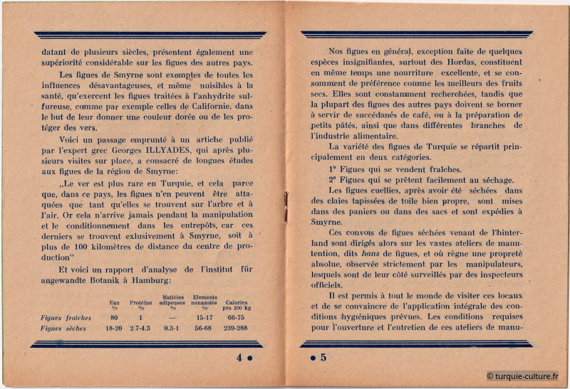 Les figues de Smyrne sont à écorce fine et de goût nettement mielleux. Leur arome caractéristique, leur couleur, leur goût exquis sont en quelque sorte d'un raffinement suprême qui rend superflue toute comparaison avec les produits similaires de n'importe quel autre pays.