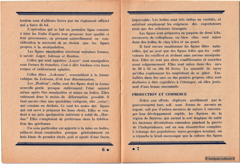 Cette perfection de nos figues, due à la qualité du sol et du climat de la Turquie d'une part, et, de l'autre, à l'habileté héréditaire et exceptionnelle des producteurs turcs, contribue au succès constant qu'elles se sont assuré sur les marchés mondiaux. II va sans dire qu'elles sont destinées à rester à jamais sans rivales. Nos concurrents ont quelquefois recours à la fraude qui consiste à faire passer leur figues, ainsi que leur raisins, comme des marchandises provenant de Smyrne. Mais c'est en vain.
