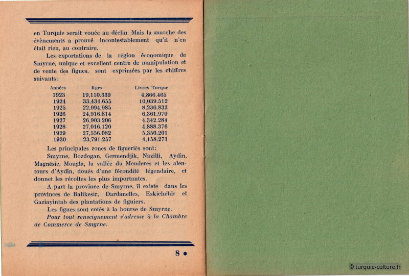 Grâce aux efforts déployés assidûment par le gouvernement ture, soit sous forme de secours en argent, soil par d'autres mesures de nature à encoura ger leur développement rapide, les figuiers de la région de Smyrne, qui eurent le sort tragique de subir les énormes dévastations commises pendant la guerre de l'Independance, ont eu une résurrection complète. L'échange des populations turco-grecques terminé, on a répandu le bruit mensonger que la culture des figues en Turquie serait vouée au déclin. Mais la marche des évènements a prouvé incontestablement qu'il n'en était rien, au contraire.
