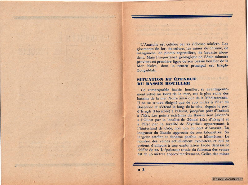 Ce remarquable bassin houiller, si avantageusement situé au bord de la mer, est le plus riche des bassins de la mer Noire ainsi que de la Méditerranée. Il ne se trouve éloigné que de 120 milles à l'Est du Bosphore et s'étend le long de la côte, depuis le port d'Eregli (Héraclée) à l'Ouest, jusqu'au port d'Ineboli à l'Est. Les points extrêmes du Bassin sont jalonnés a l'Ouest par la localité de Günazi (Est d'Eregli) et à l'Est par la localité de Söyütözü appartenant à l'hinterland de Cide, non loin du port d'Amasra. La longueur du Bassin approche de 200 kilomètres. Sa largeur atteint et dépasse parfois to kilomètres. Le nombre des veines actuellement exploitées et qui se prêtent d'ailleurs à une exploitation facile dépasse le chiffre de 22. L'épaisseur totale du faisceau des veines est de 40 mètres approximativement. Celles des mines de Zongouldak présentent en moyenne une épaisseur de 1 m. 50, épaisseur qui est supérieure à la moyenne des veines des districts houillers de la France, de la Belgique et de la Rühr.