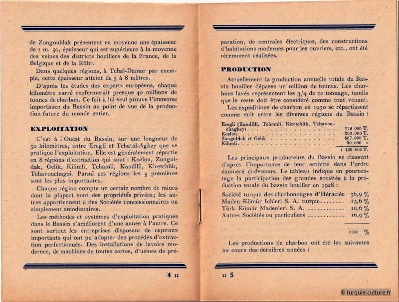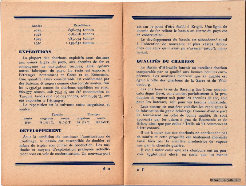 La plupart des charbons exploités sont destinés aux usines à gaz du pays, aux chemins de fer et compagnies de navigation turques, ainsi qu'aux autres fabriques du pays. Le reste est exporté à l'étranger, notamment en Grèce et en Roumanie. Une quantité assez considérable est consommée par des bateaux étrangers comme charbon de soutes. Sur les 1.139.652 tonnes de charbons expédiées en 1930, 860.577 tonnes, soit 75,5% ont été consommées en Turquie, tandis que 279.074 tonnes, soit 24,49%, ont été exportées à l'étranger.