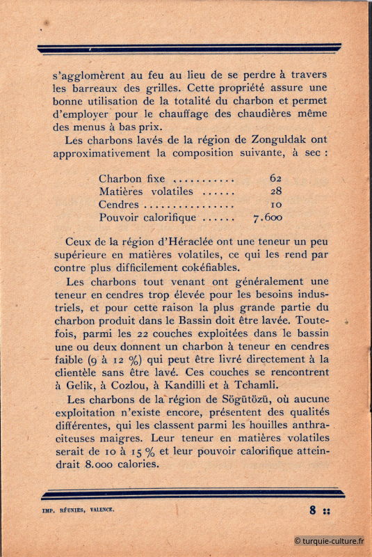 Le Bassin d'Héraclée fournit un excellent charbon comparable par sa qualité aux bonnes houilles européennes. Les analyses montrent que sa qualité est égale à celle des charbons de la Sarre et du Waldenburg.