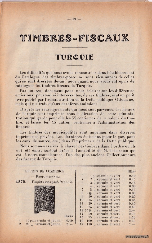 Les difficultés que nous avons rencontrées dans l'établissement du Catalogue des timbres-poste ne sont rien auprès de celles qui se sont dressées devant nous quand nous avons entrepris de cataloguer les timbres fiscaux de Turquie.