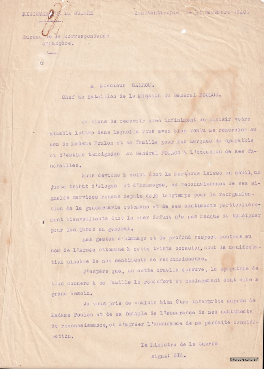Le Général de Brigade Gaston Alphonse Foulon (1870-1920) fut nommé Général de Brigade en 1919. Il fut Inspecteur Général de la Gendarmerie Ottomane à Constantinople. [source : https://museedesetoiles.fr/piece/general-de-brigade-foulon/] C’est à ce titre que le Ministère de la Guerre ottoman lui rend hommage.]