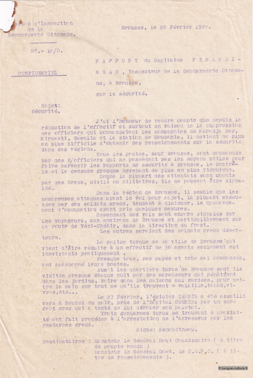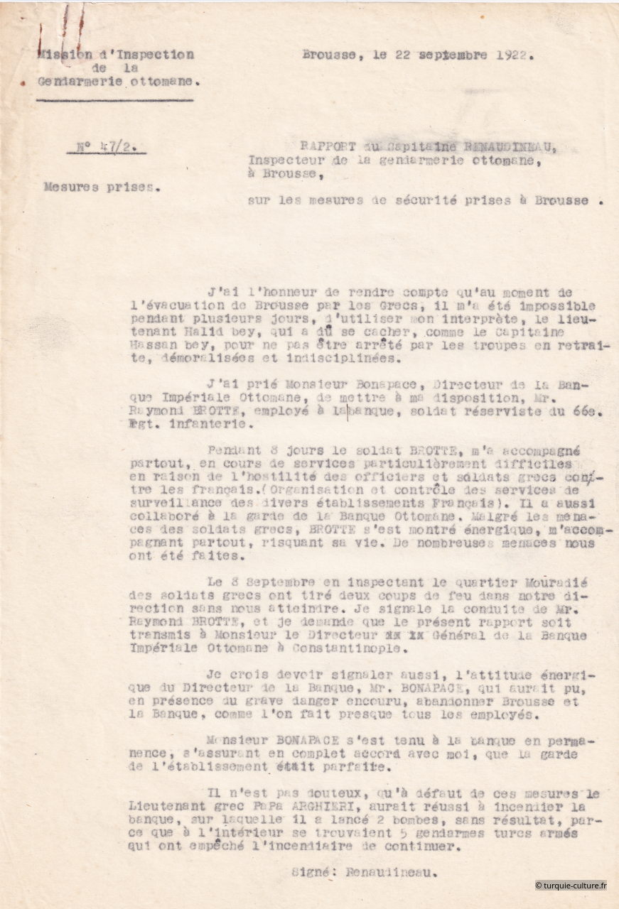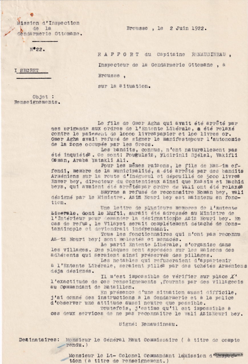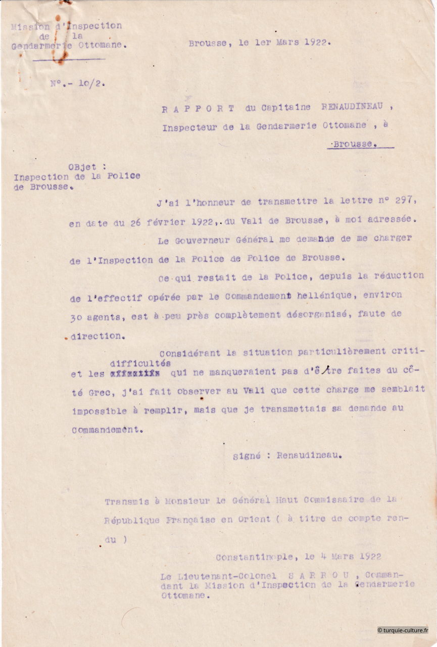 RAPPORT du capitaine RENAUDINEAU, Inspecteur de la gendarmerie ottomane, à Brousse,