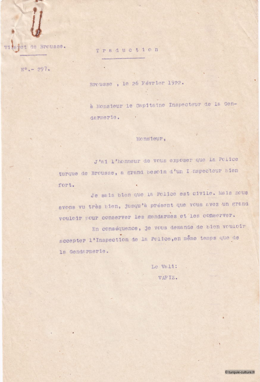 J'ai l'honneur de transmettre la lettre nº 297, en date du 26 février 1922, du Vali de Brousse, à moi adressée.