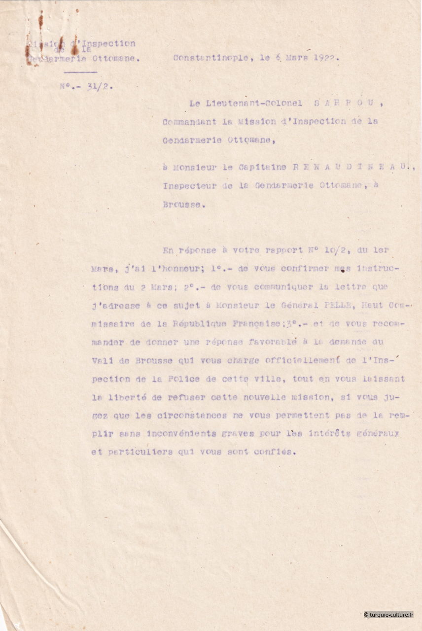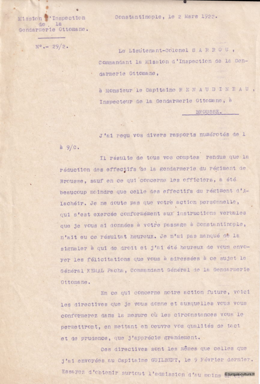 Le Lieutenant-colonel Sarrou (1864-1968), commandant la Mission d'Inspection de la Gendarmerie Ottomane, envoya également des instructions pour l’organisation de la gendarmerie ottomane dans des lettres du 26 février, 2 et 3 mars 1922.