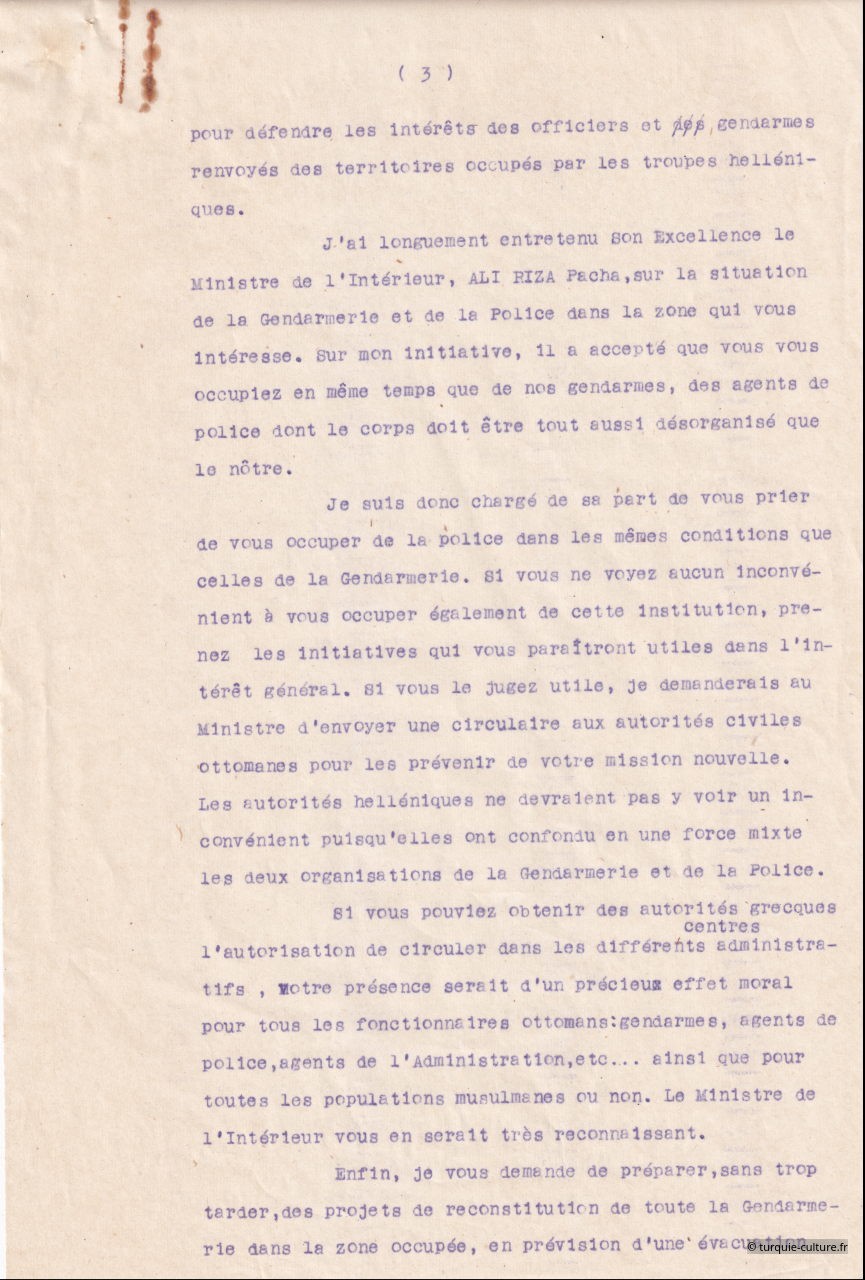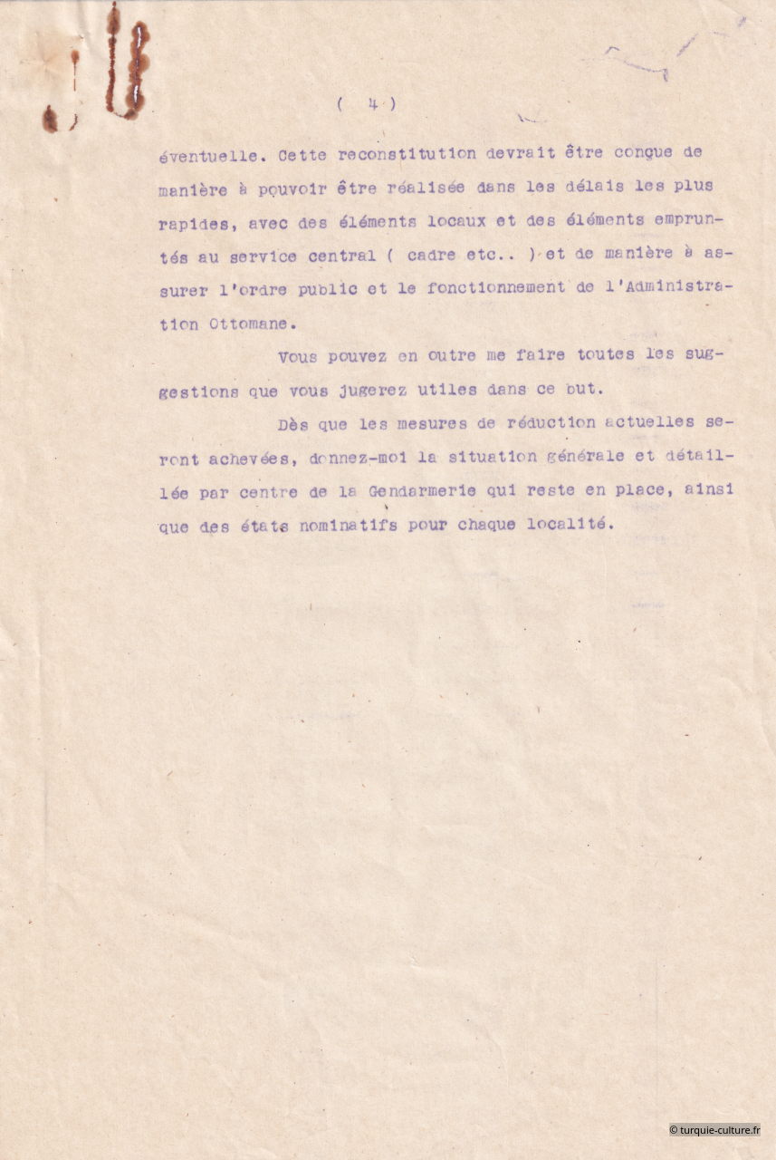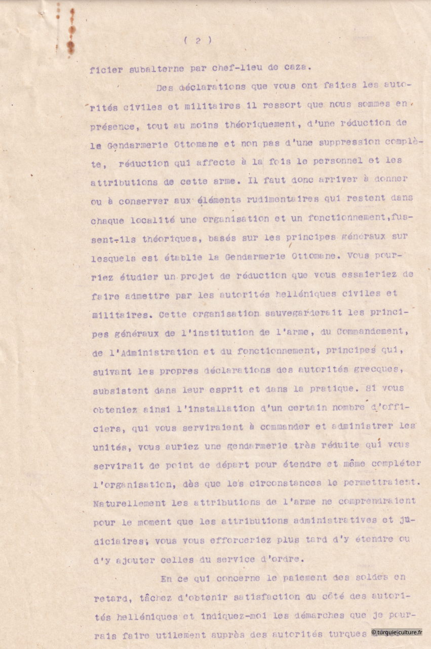 Il demande aussi de s’occuper des soldes, de prendre également en charge l’organisation de la police de la même façon et de prévoir un projet de reconstitution de la gendarmerie ottomane en cas d’évacuation. Le capitaine devra faire un nouveau rapport.]