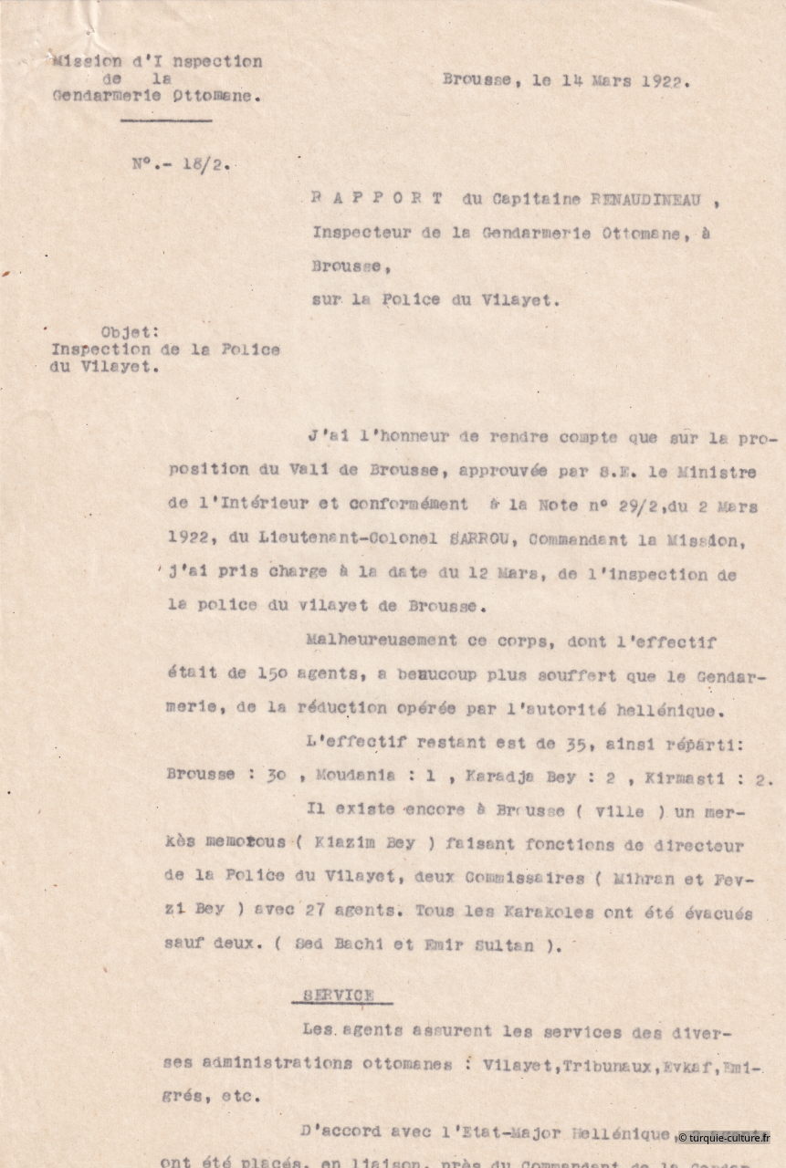 [Rapport du Capitaine Renaudeau, 14 mars 1922 : il prend en charge l'inspection de la police du vilayet de Brousse. Il dresse un état des lieux d’une situation critique pour la gendarmerie turque et prend des mesures.]