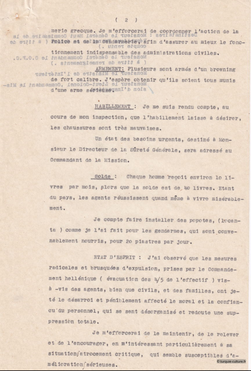 Tous les postes, sauf Brousse, sont commandés par des S[ous]/officiers qui ne possèdent pas les moyens utiles pour faire parvenir les rapports de sécurité à Brousse, le contrôle et le censure grecque deviennent de plus en plus rigoureux.