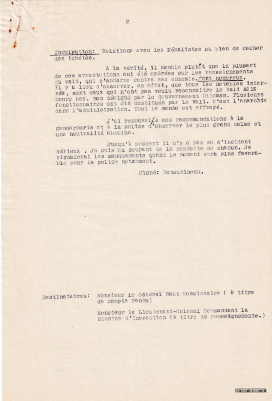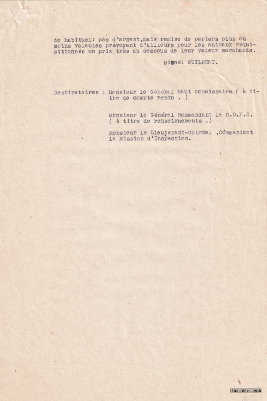 Destinataires : Monsieur le Général Haut Commissaire de la République Française en Orient (à titre de compte rendu.)