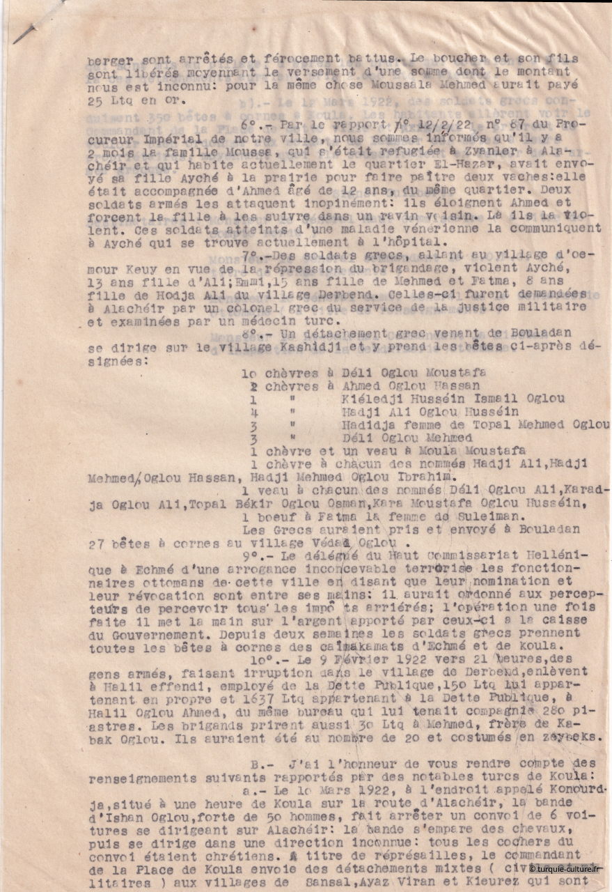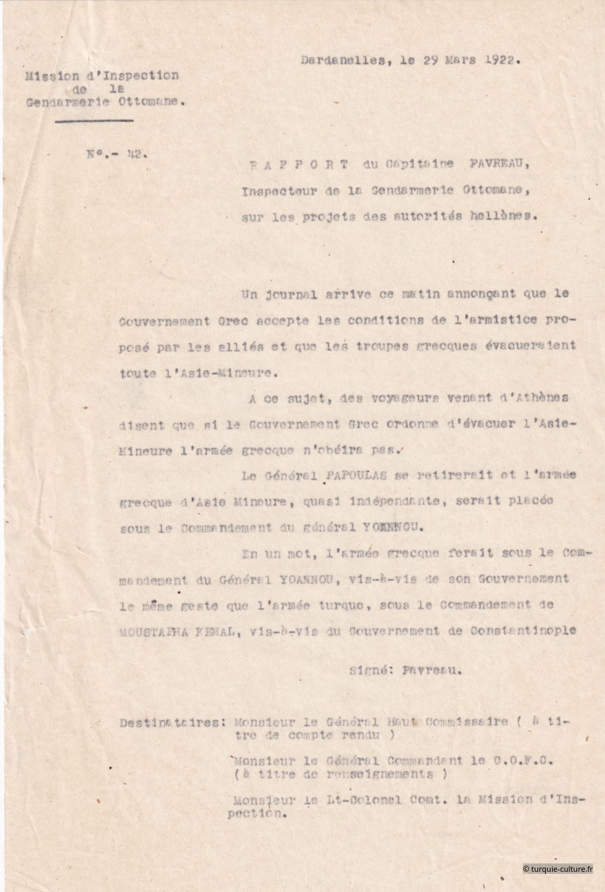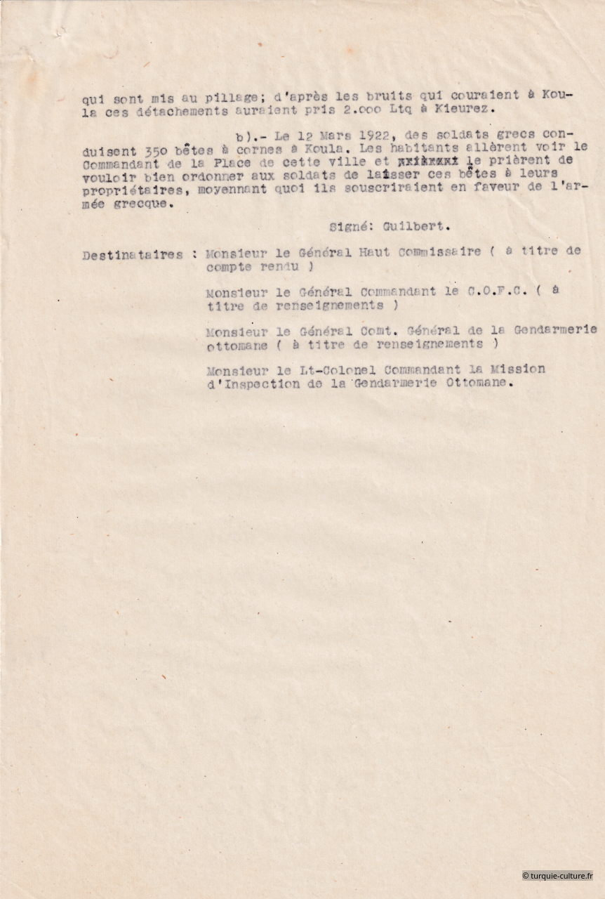 J'ai l'honneur de rendre compte qu'au moment de l'évacuation de Brousse par les Grecs, il m'a été impossible pendant plusieurs jours, d'utiliser mon interprète, le lieutenant Halid bey, qui a dû se cacher, comme le Capitaine Hassan bey, pour ne pas être arrêté par les troupes en retraite, démoralisées et indisciplinées.