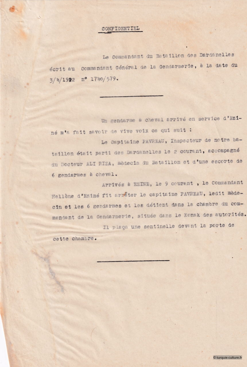 Considérant la situation particulièrement critique et les difficultés qui ne manqueraient pas d'être faites au côté Grec, j'ai fait observer au Vali que cette charge me semblait impossible à remplir, mais que je transmettais se demande au commandement.