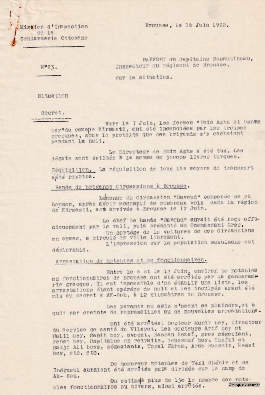 Les documents reproduits ci-dessous témoignent des conditions de l’occupation grecque de Bursa et de sa région lors de la guerre gréco-turque de 1921-1922. Ces témoignages émanent d’officiers français chargés de la réorganisation de la gendarmerie ottomane, qui fut entreprise en 1904 en Macédoine, avant le déclenchement de la Première guerre mondiale et qui continua après la fin de la guerre. Il s’agit des capitaines Neau (Bursa), Renaudineau (Bursa), Guilbert (Izmir) qui décrivent les rapports difficiles des Turcs, gendarmes ou civils, mais aussi des militaires français, avec l’occupant grec arrivé en mai 1919 et à Bursa, le 8 juillet 1920.