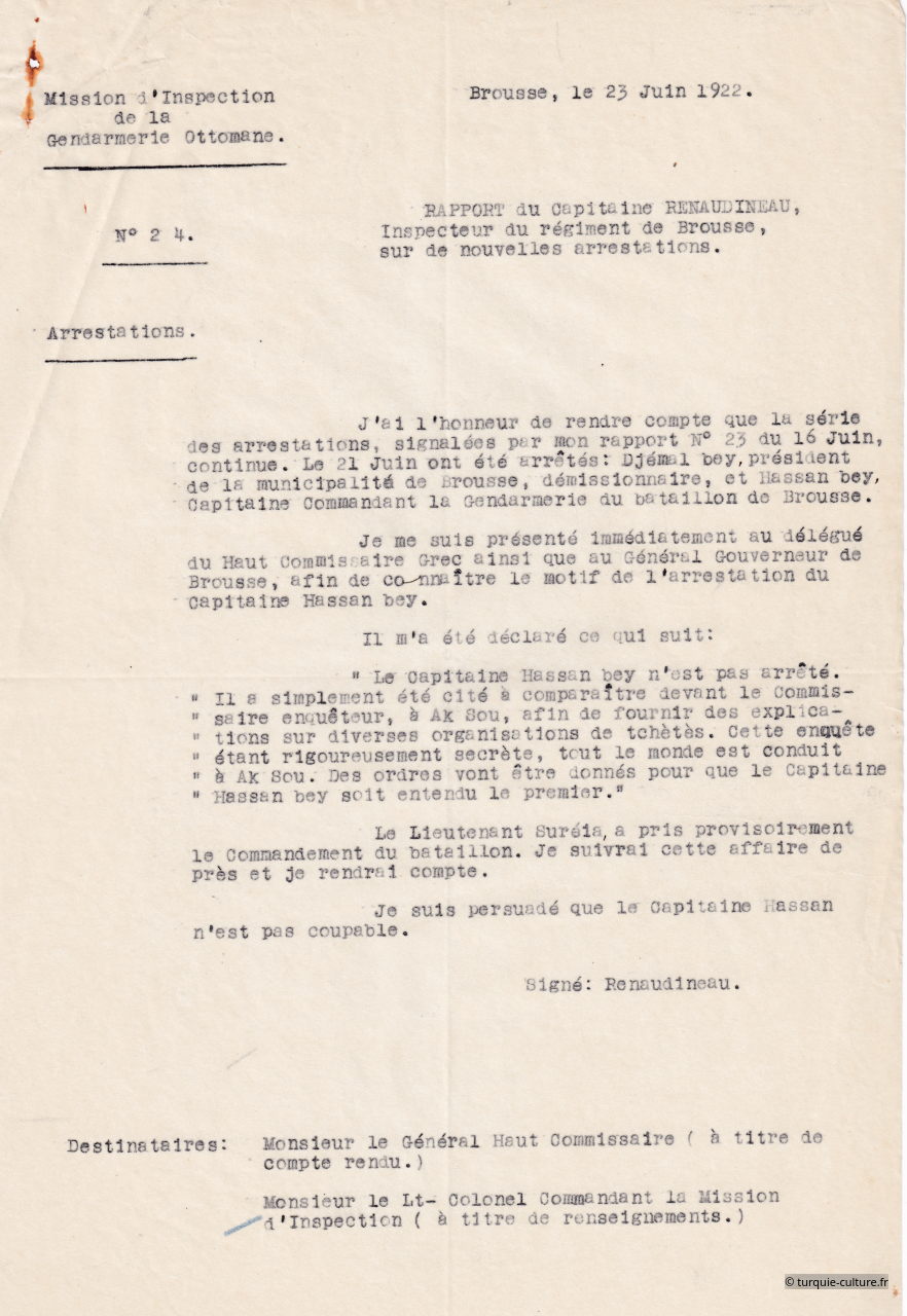 J'ai l'honneur de rendre compte que la série des arrestations, signalées par mon rapport Nº 23 du 16 Juin, continue. Le 21 Juin ont été arrêtés: Djémal bey, président de ls municipalité de Brousse, démissionnaire, et Hassan bey, Capitaine Commandant la gendarmerie du bataillon de Brousse.