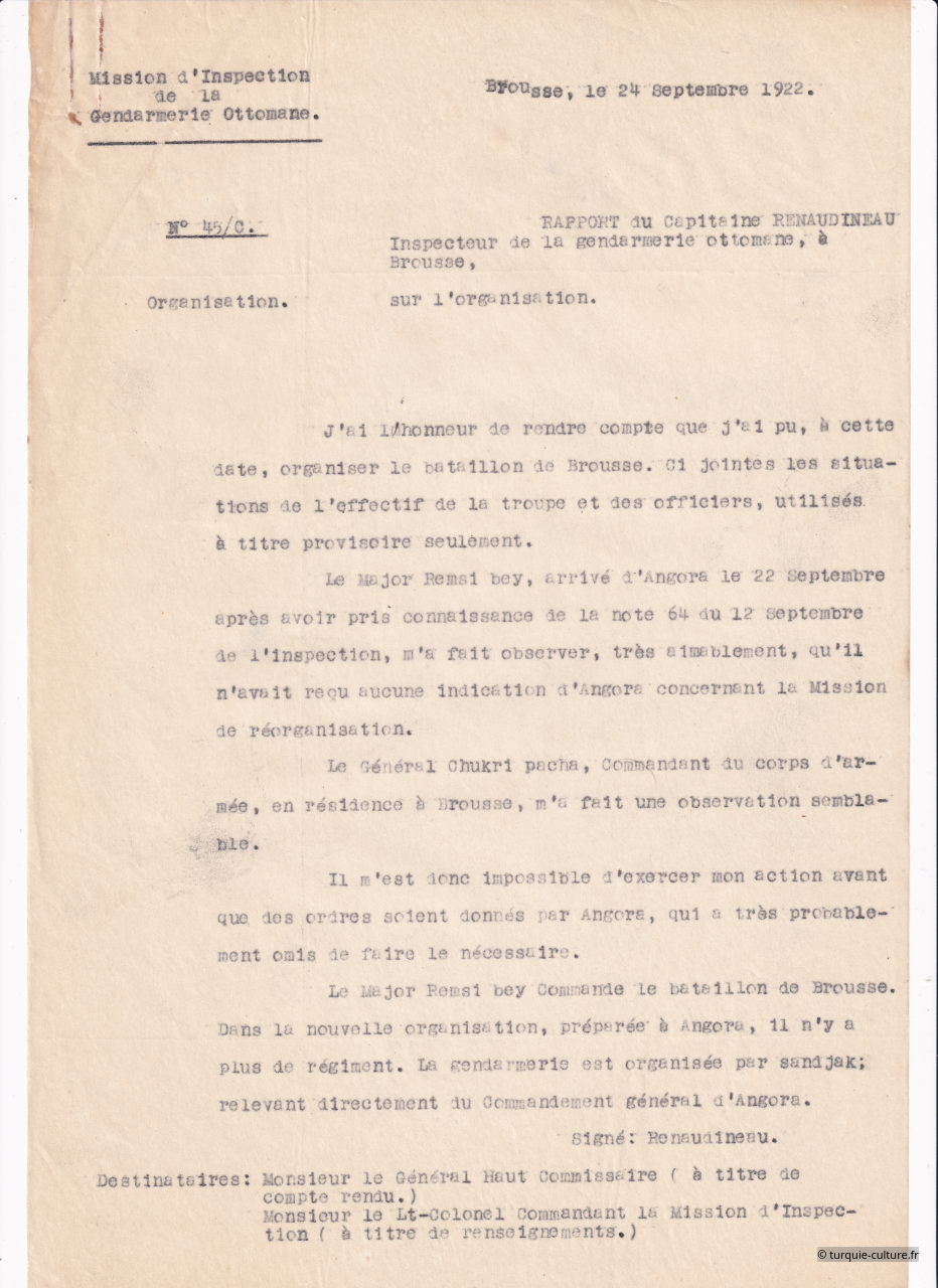 à monsieur le Capitaine RENAUDINEAU, Inspecteur de la Gendarmerie Ottomane, à BROUSSE.