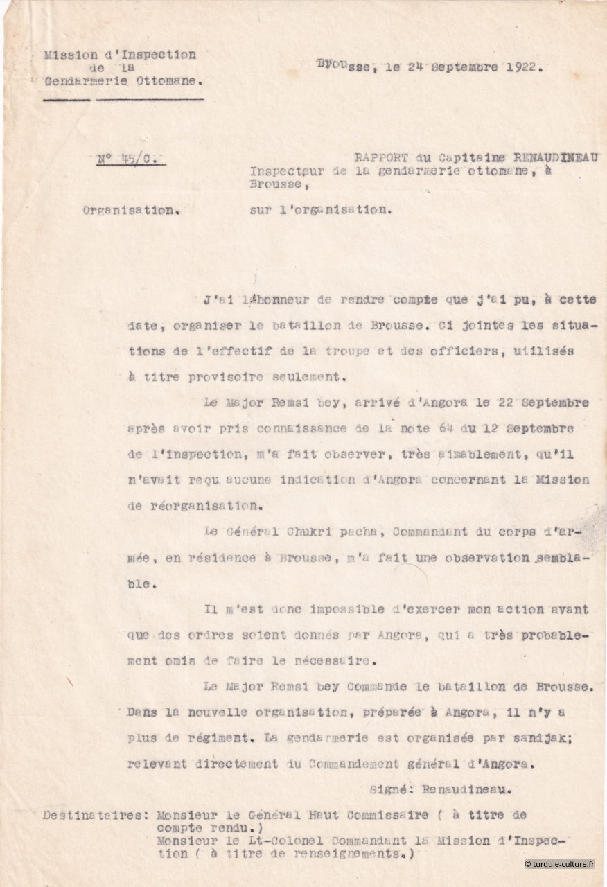 RAPPORT du Capitaine RENAUDINEAU, Inspecteur de la gendarmerie ottomane, à Brousse, sur l'organisation.