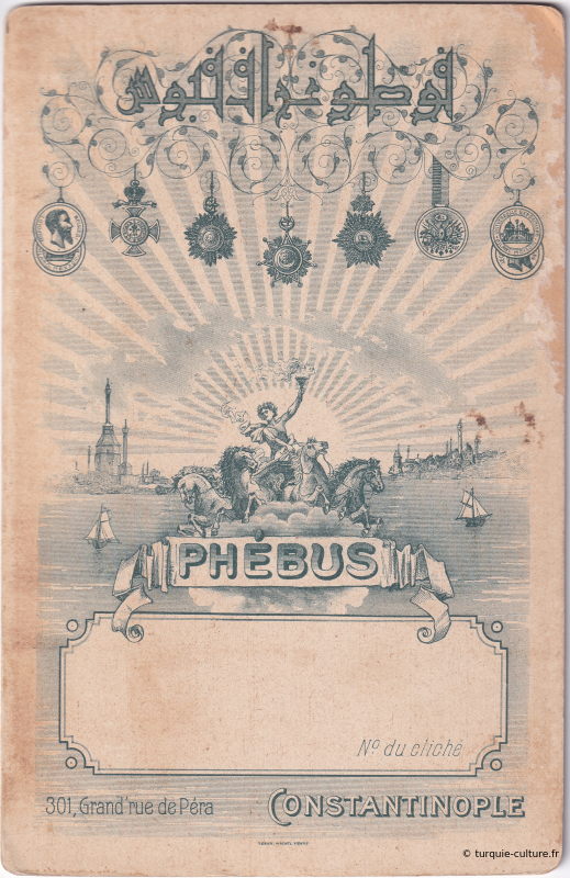 Portrait, vers 1900. Verso de style Art nouveau avec,en haut, mention en caractères arabes "Fotografya Febüs"