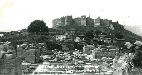 Carte postale photographique en noir et blanc signée Cemal, montrant la citadelle turque de Selçuk à Ephèse et les ruines de la basilique Saint-Jean dans les années 1950-1960.