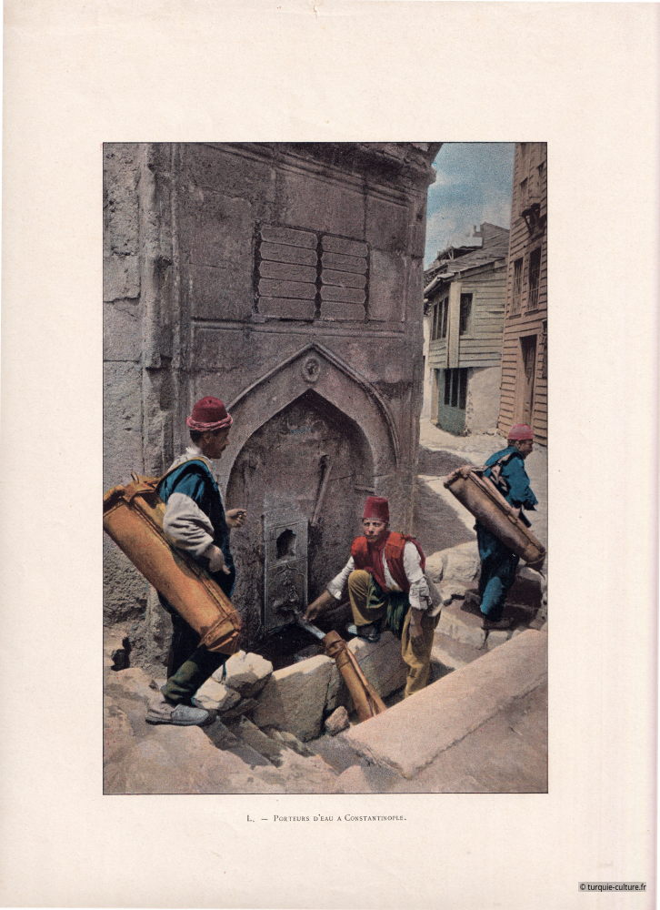 Aussi dans les villes turques, et particulièrement à Constantinople, y a-t-il beaucoup de porteurs d'eau, charroyant dans des cylindres de cuir ou de fer blanc la marchandise qu'ils puisent aux fontaines publiques.