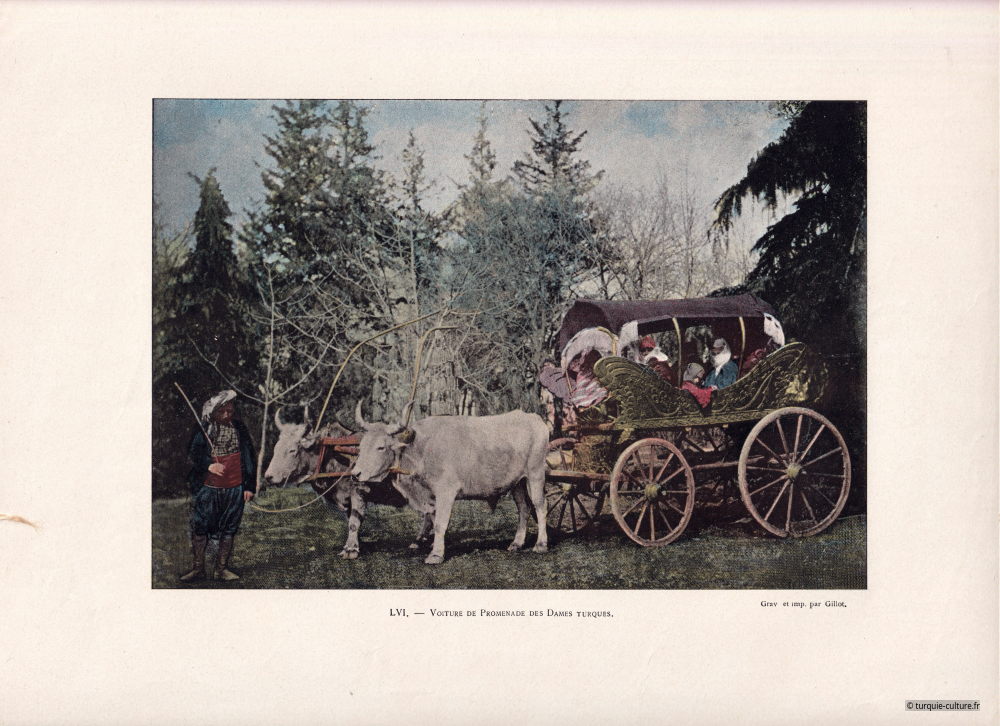 Elles ont les promenades qui, les vendredis et les dimanches de la belle saison, sont de véritables parties de campagne où l'on emporte des provisions de bouche: le vendredi elles vont assez généralement en caïq, aux Eaux-douces d'Asie; le dimanche est plus particulièrement réservé aux Eaux-douces d'Europe, où elles se rendent dans des Arabes, voitures assez curieuses d'aspect et attelées de bœufs.