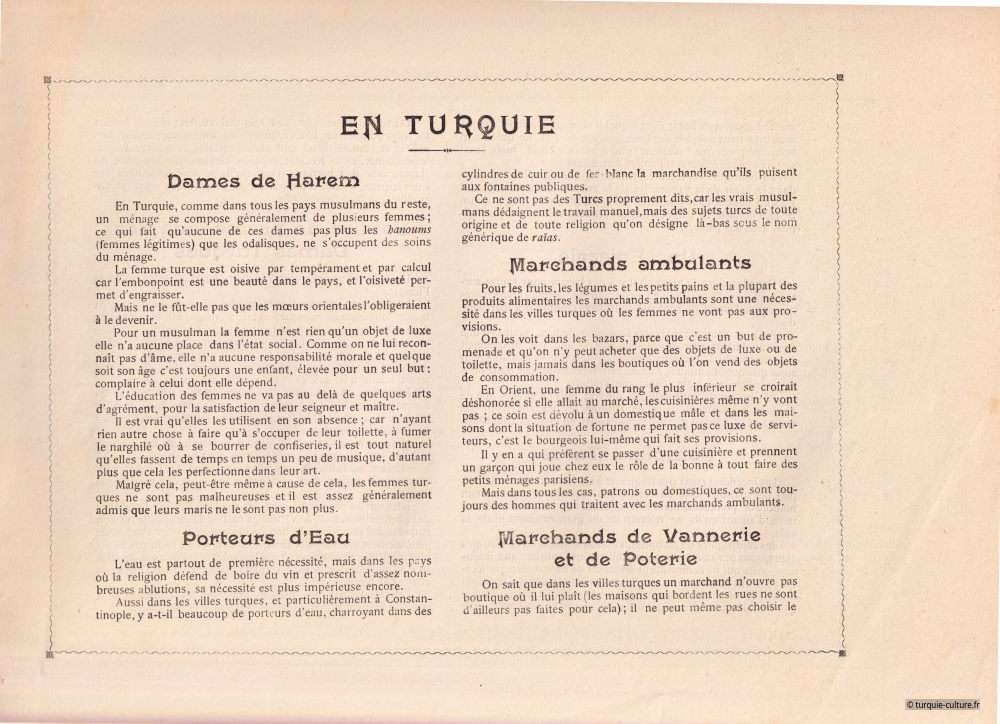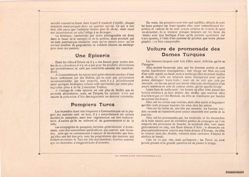 Le texte n'est pas exempt d'erreurs ou de préjugés, comme la légende présentant des femmes du Harem qui sont en fait des bohémiennes ayant posé dans le studio de Sébah et Joaillier. Cette image fut très souvent reproduite sur des cartes postales en noir et blanc et en couleurs avec d'autres légendes. Autre exemple, les pompiers n'étaient pas tous arméniens...